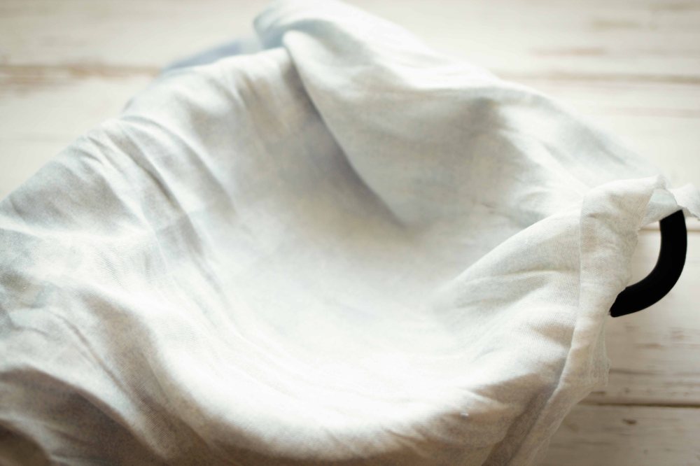 Je laisse généralement la teinture refroidir dans un endroit frais. Je laisse aussi la teinture dans l’eau pendant 2 jours mais cela peut être plus court. Ensuite, l’idéal est de filtrer les brous pour ne laisser que la teinture. Pour filtrer, mettez le chiffon sur la passoire.