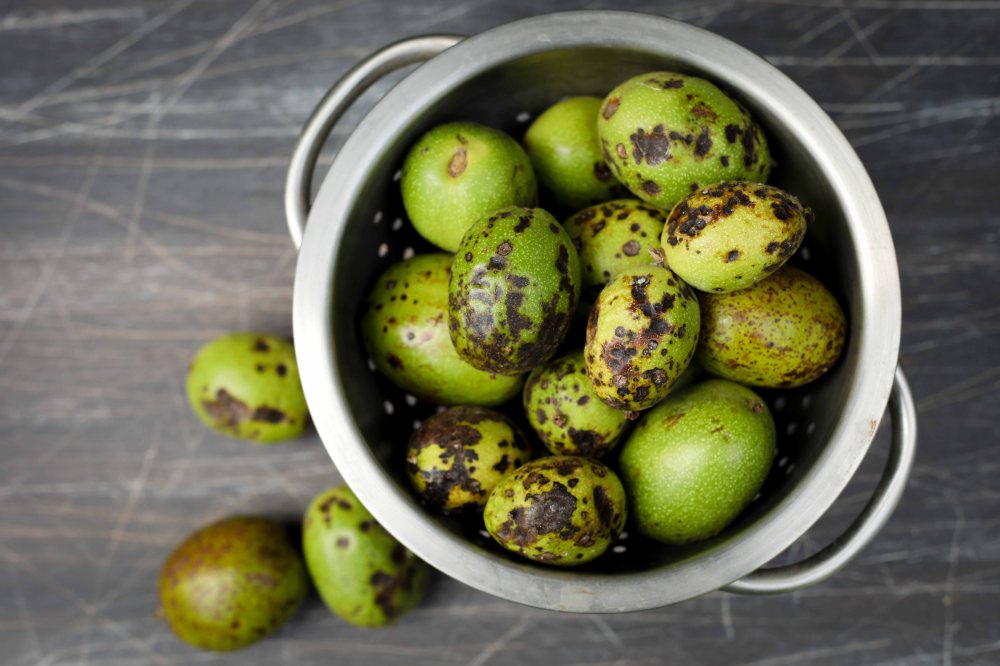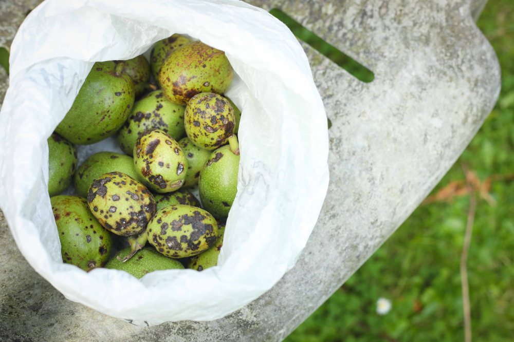 Choisissez des noix vertes, qu’elles soient très bien conservées ou non. J’ai préféré celles avec des taches et des défauts.