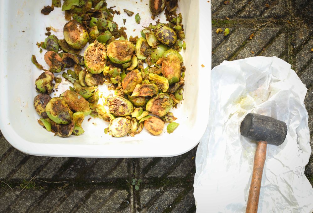 Mettez-les dans un sac en papier ou dans du papier journal et écrasez-les avec un maillet (ou un marteau si vous n’avez pas de maillet) mais sans les casser. L’idée est d’extraire la coque verte ou brou sans endommager la noix. Puis à l’aide d’un couteau, retirez le reste de la peau.