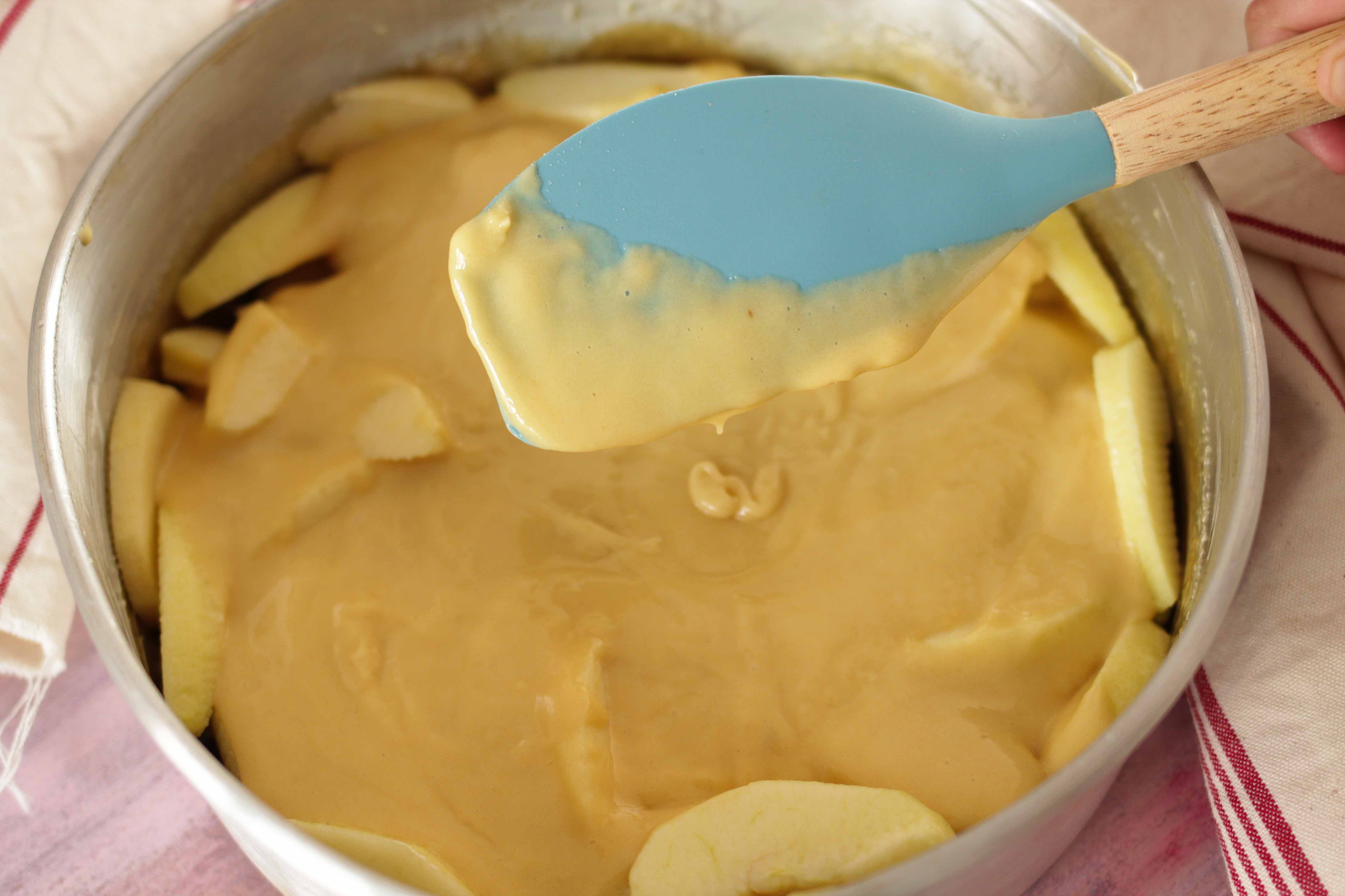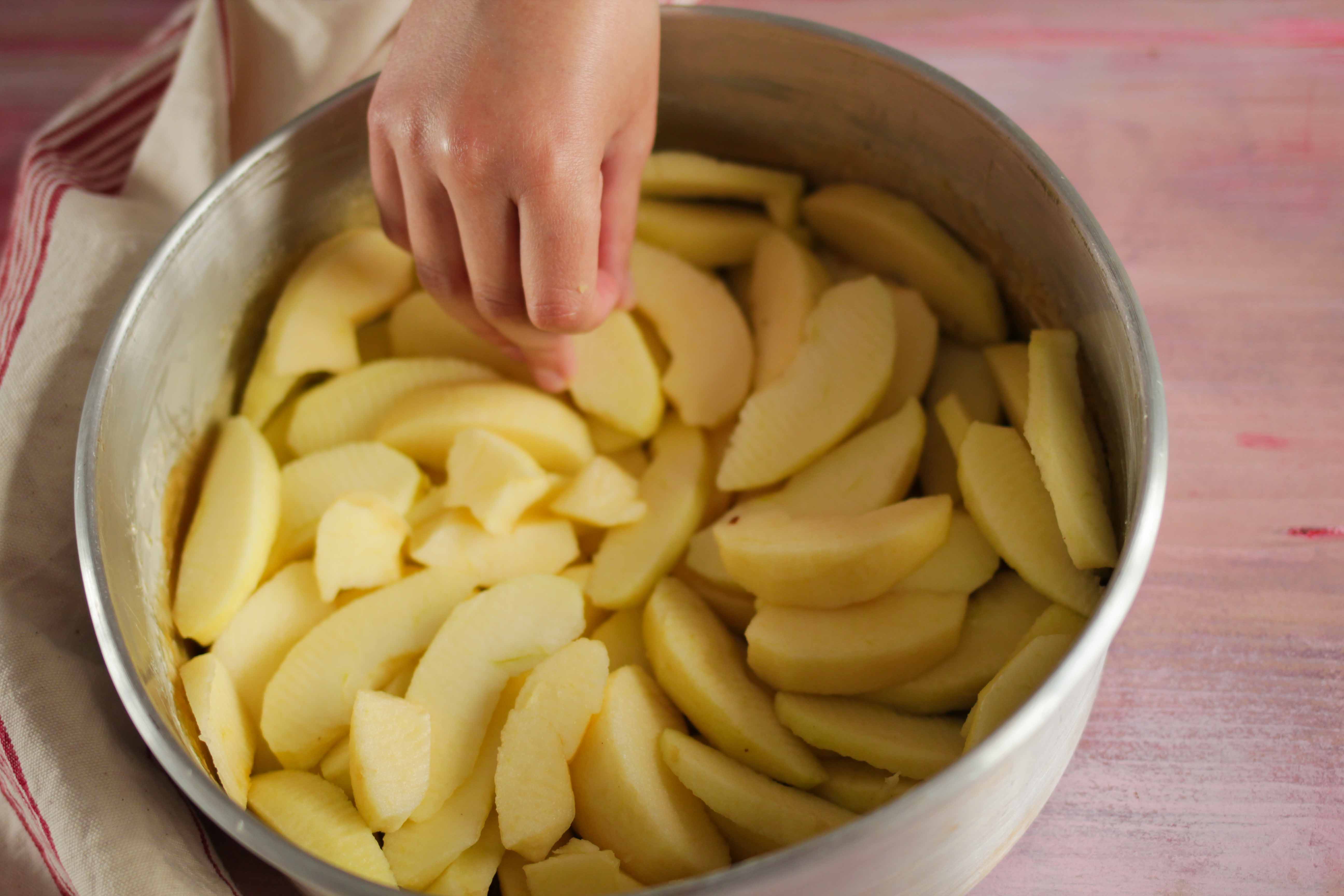 Maintenant, mélangez tout. Ce n’est que lorsque la pâte est prête que les pommes doivent être pelées, sinon elles noirciront. Il faut les couper en fines tranches. J’aime donner une forme artistique mais vous pouvez les organiser comme vous le souhaitez. Le but est de recouvrir complètement le fond avec des pommes. Placez-en également sur les côtés.
